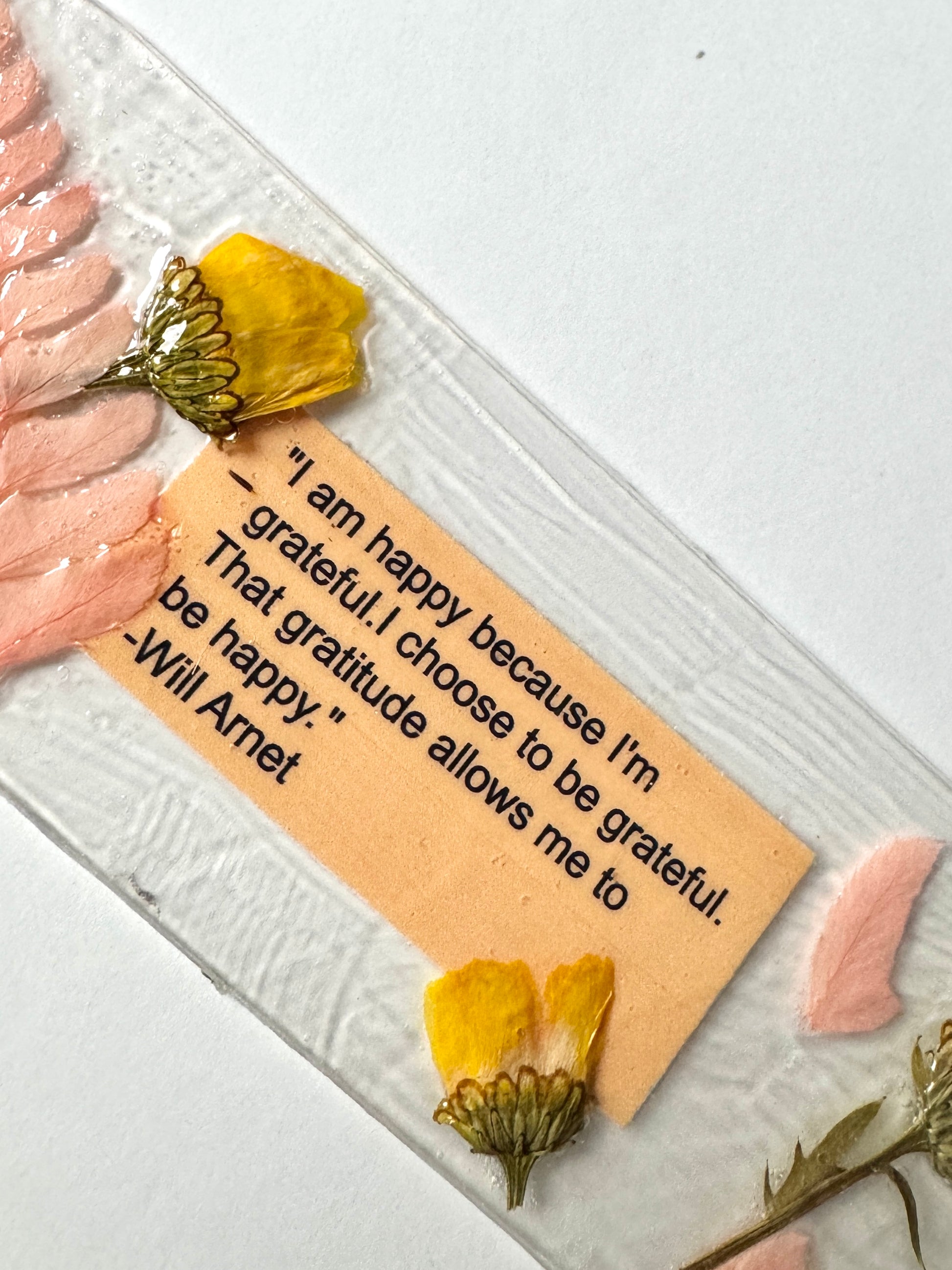 Each one is one of a kind. Some with floral designs, pressed flowers, and pressed leaves. Each with its own special quote. Finished with light weight ribbon.