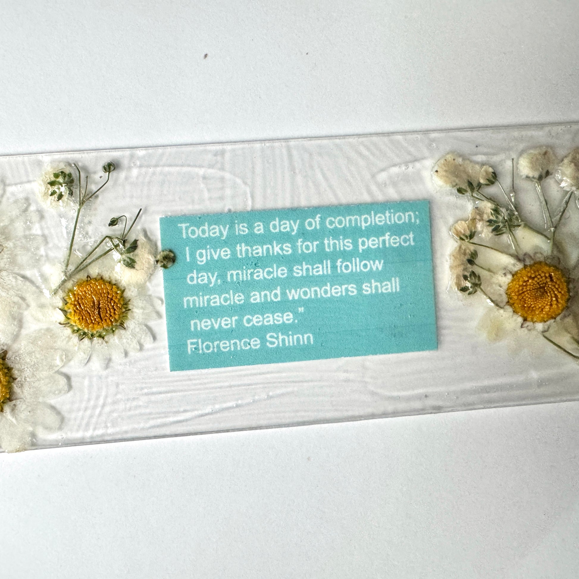 Each one is one of a kind. Some with floral designs, pressed flowers, and pressed leaves. Each with its own special quote. Finished with light weight ribbon.