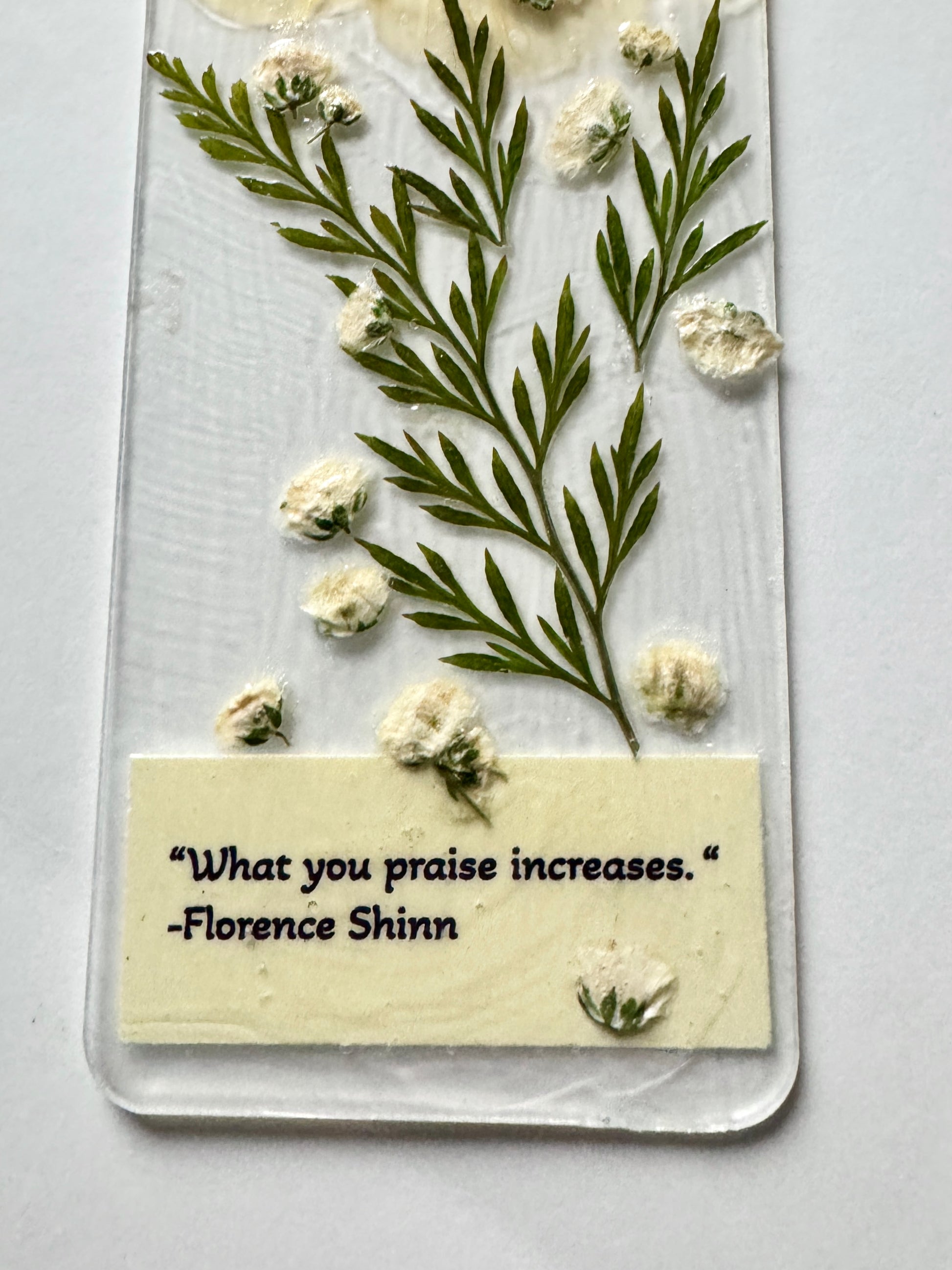 Each one is one of a kind. Some with floral designs, pressed flowers, and pressed leaves. Each with its own special quote. Finished with light weight ribbon.