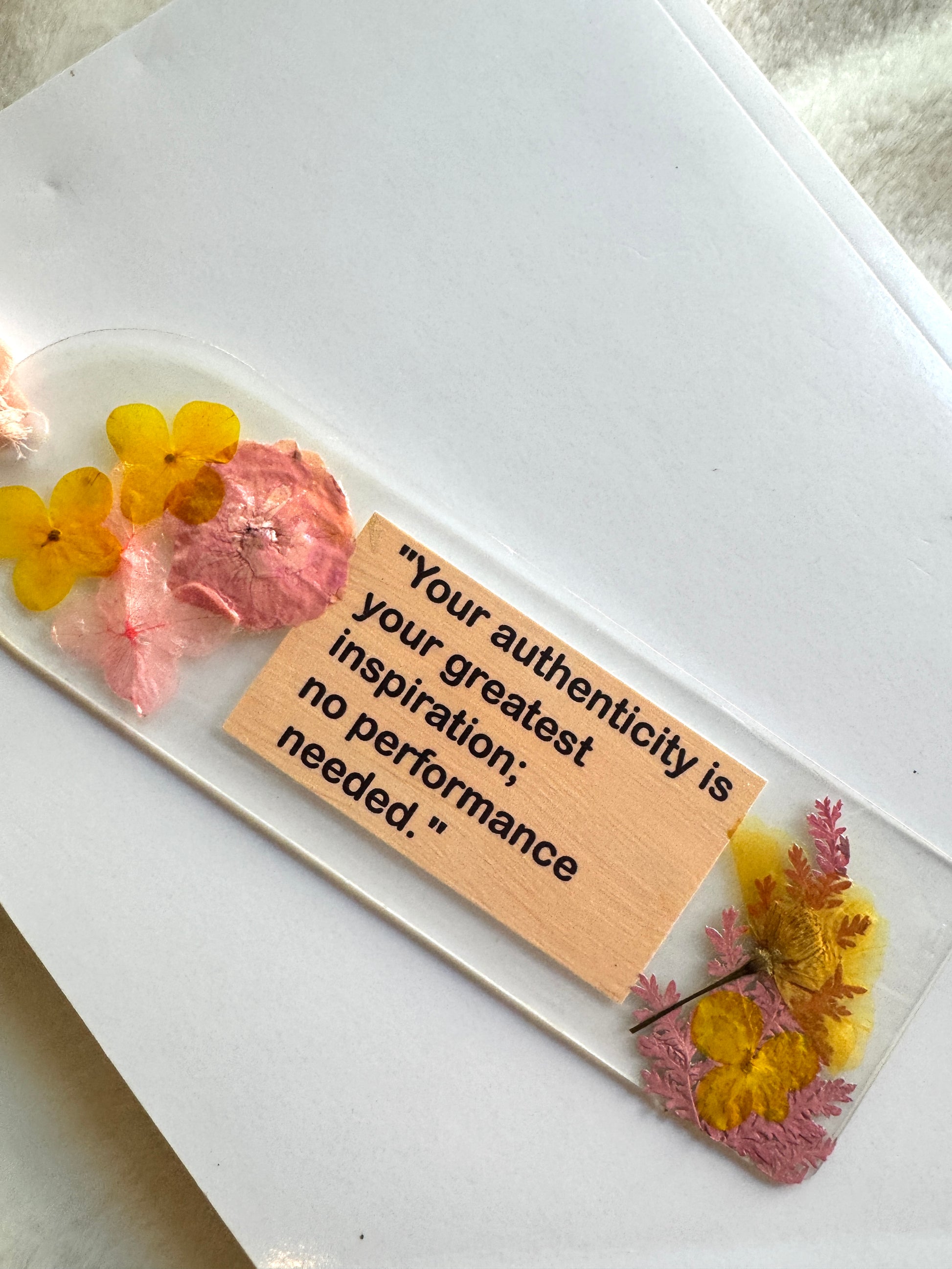 Each one is one of a kind. Some with floral designs, pressed flowers, and pressed leaves. Each with its own special quote. Finished with light weight ribbon.